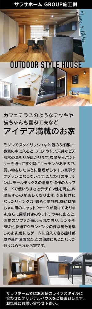 モダンで洗練された外観のS様邸。天然木の温もりある室内と家事ラク動線が魅力。吹き抜けリビングやキャットウォーク、屋根付きウッドデッキで暮らしと趣味を楽しむ住まい。