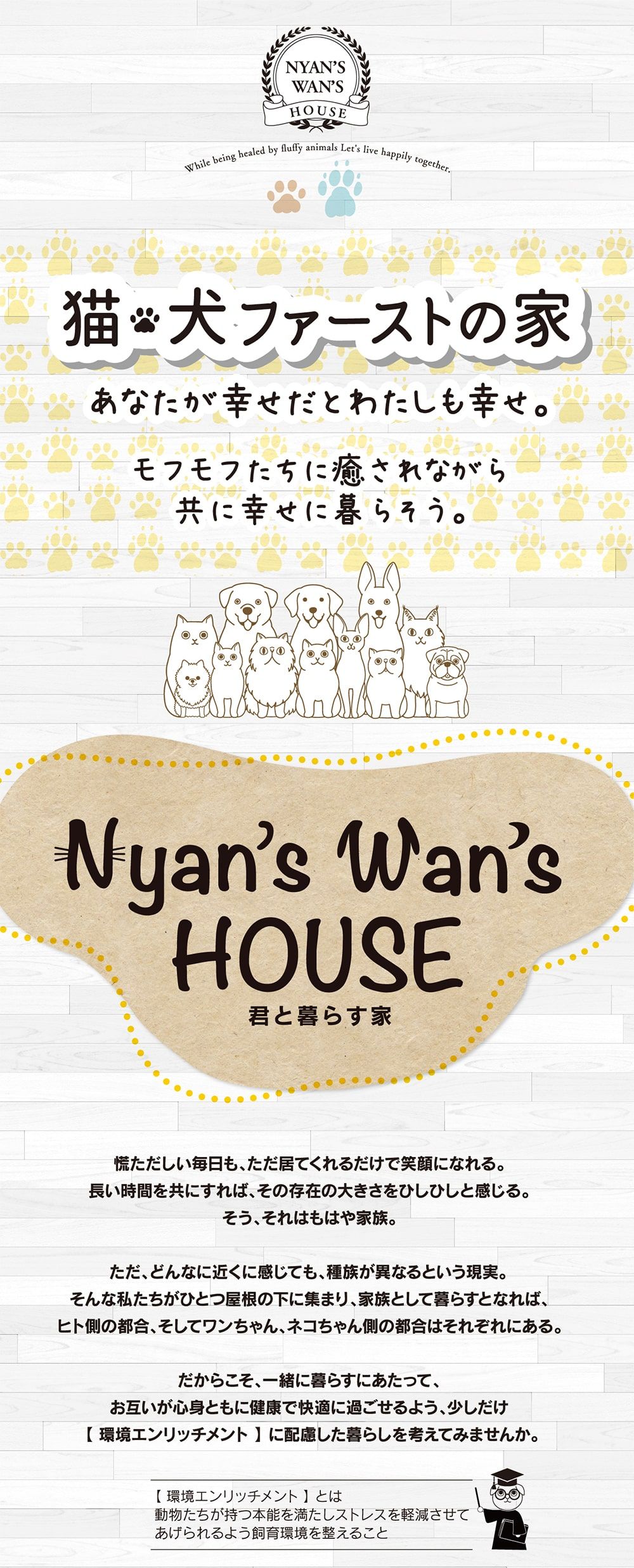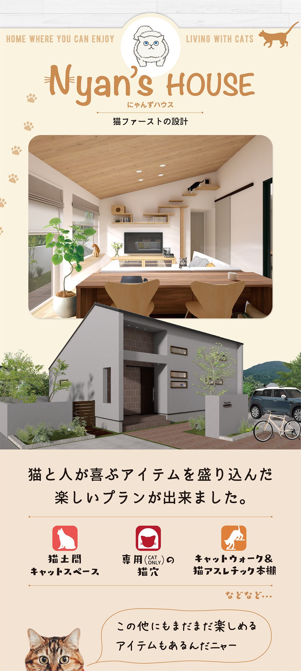 モフモフたちに癒やされながらともに幸せに暮らす【にゃんずわんずハウス】が誕生。家族みんなが幸せに暮らせる家づくりをお考えの方にパンフレットを差し上げます。まずはお気軽にお問い合わせ下さい。