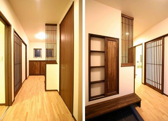 北茨城市 H様邸 太陽の光を電気に変える自家発電! エネルギーを創って売れるECOモダンハウス。 (2010年10月30日〜11月1日に見学会を行いました。) ギャラリー 格子がお客様を温かくお出迎えする玄関。壁面に備え付けたベンチは、お出かけの準備や、たくさんの荷物を持って帰宅の際など、どんな場面でも優しくお手伝いしてくれます。 床材にはラバーウッド無垢床を使用。TVボードの壁一面には、調湿・脱臭効果のあるエコカラットを使用しました。 塗り壁には珪藻土を使用。伝統的な和の空間が完成致しました。