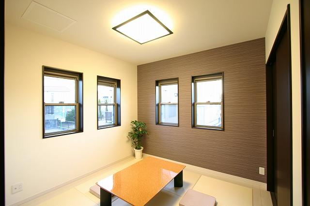 北茨城市 S様邸 長期優良住宅認定のシンプルモダンハウス ギャラリー ホワイトの床×ブラウンの建具で統一された室内。清潔感漂う空間に仕上がりました。 壁一面の色を変えてアクセントを効かせた現代的な和の空間。 主寝室は、ブラウンの床材に。大人の空間が完成しました。